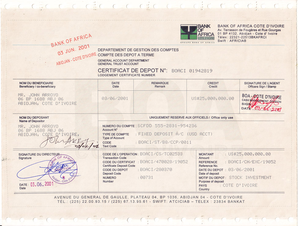 The money is deposited with the BANK OF AFRICA LOCATED IN ABIDJAN THE ECONOMIC CAPITAL OF COTE D' IVOIRE (IVORY COAST) FULL NAME OF MY CLIENT IS: MR.JOHN ARROYO (LATE) THE MONEY IS STILL IN THE BANK OF AFRICA UPTIL DATE. I am attaching in this email the copy of the deposit receipt as prove of deposit by late Mr.Arroyo. Also attached in this email is is the last statement of account of late Mr. Arroyo. If you are sure that you will be discret in handling this transaction without the knowledge of any second party, then we can do business. Like I said before, I do not want anything that will jeoperdise my profession and intergrity. The details provided here are through to the best of my knowledge and God is my witness. I dont want you in anyway to see this deal as a sin or risk because everything will pass through normal legal process without you or me going contrary to any local or international law. If you are ready to work with me, then contact me for further directives. Regards Mr. Ted Apostoleris.