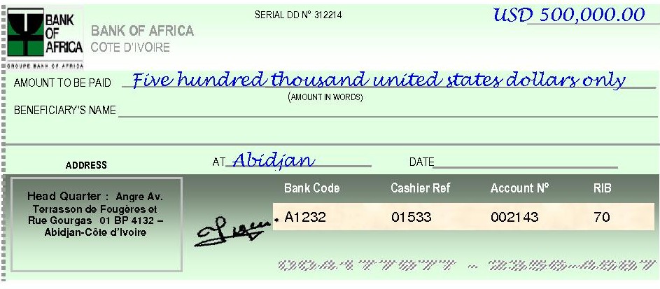 I received your message in regards to the cheque Mr. Robert Johnson asked me to send to you and all content was well noted and understood, as a matter of urgency your check will be delivered to you as soon as I received the delivery charges. As reading from Mr. Johnson, I contacted the courier service to see how much it will cost to send the cheque across to USA and they said is 150, 000.00cfa our local currency which will be about US$300.00, send the money directly to me through western union money transfer in my name Mr. Frank Bru, Address: Abidjan, Cote D'Ivoire. Finally, also send me your full contact address where the cheque will be delievered to, you can call me on +22501670568 Mr. Frank Bru. Regards, Frank |