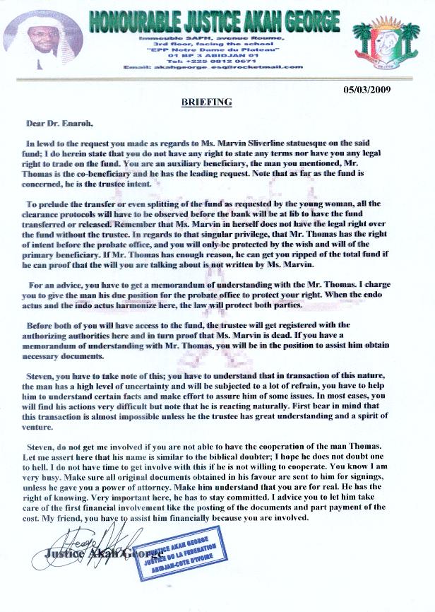 I am not sure what a lot of this email means. The bank that they went to was Banque Atlantique of Abidjan, Cote d’Ivoire. There is no record of any account or deposit from Emmanuel Marvin at that bank. So how do we explain this? Do you think the evil Paul Peters stole the money? Is that what you are implying? Because if you are suggesting that the idiot George Akah had anything to do with this you are dead wrong. I already proved to you that he is a fraud and therefore has no power to do what he said. My lawyer already proved that there is no Chief Justice George Akah. I don’t understand why you think a trip to Cote d’Ivoire would be required of me, if my lawyers, who know Cote d’Ivoire laws and regulations better than we do can’t find anything, what am I supposed to do? I will make the trip if it is absolutely necessary, but this whole transaction is starting to look really fishy. Thomas |